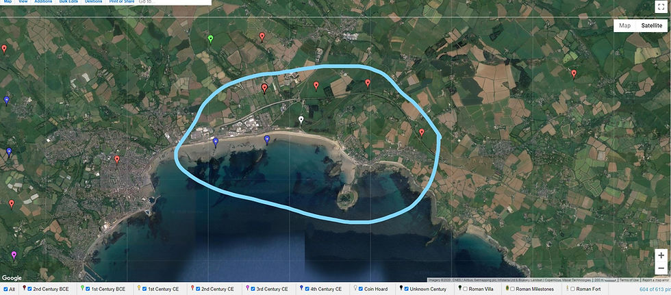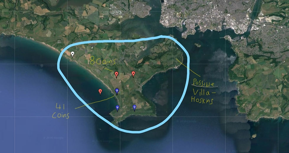The second of my points is an entirely new finding for me and one that this post's title refers to; a possible Roman (or perhaps more likely a Roman influenced) Villa Rustica, or Country Estate. This is because one of the Cornish hotspots for coin finds appeared in the recording of the last 200 coins and occurs in the Parish of Maker-with-Rame. Given the sudden increase of coins appearing in the area, I briefly looked into the area's history and discovered that in 1962 Dr. W. G. Hoskins writes that the site was, in his opinion, likely a Roman Villa, given that there was mention in 1066 of a stone house in the area, given that Maker is a varient of Magor, Cornish for ruin or old walls, and the name is first recorded in 705 CE and given that the only place a Roman (influenced) Villa has been found in Cornwall thus far is at Magor in West-Cornwall. Therefore these coins may provide evidence to support his theory. However it must be noted that they could be unrelated, especially given Dr. Hoskins believed the Villa to lie in the opposite side of the small parish's peninsula to where the coins are largely located, though of course the villa could have had large agricultural estates extending towards the area these coins are being found. So, when this is being fully investigated in my writeup, my aims will specifically be to ascertain whether or not this data supports or is even related to a potential Roman Villa in the area (and it must be reaffirmed that this villa does not definitely exist). If so, why are the coins not nearer Hoskins proposed site for the villa and, if not, why might these coins occur in this area in such numbers.